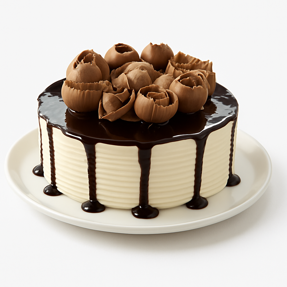 Una combinación irresistible de flan cremoso, bizcocho de vainilla con leche de mocka y un relleno suave de crema de queso sabor mocka. Decorado con caídas y rulos de chocolate oscuro que elevan su aroma y sabor.Un pastel elegante, intenso y perfecto para cualquier ocasión.